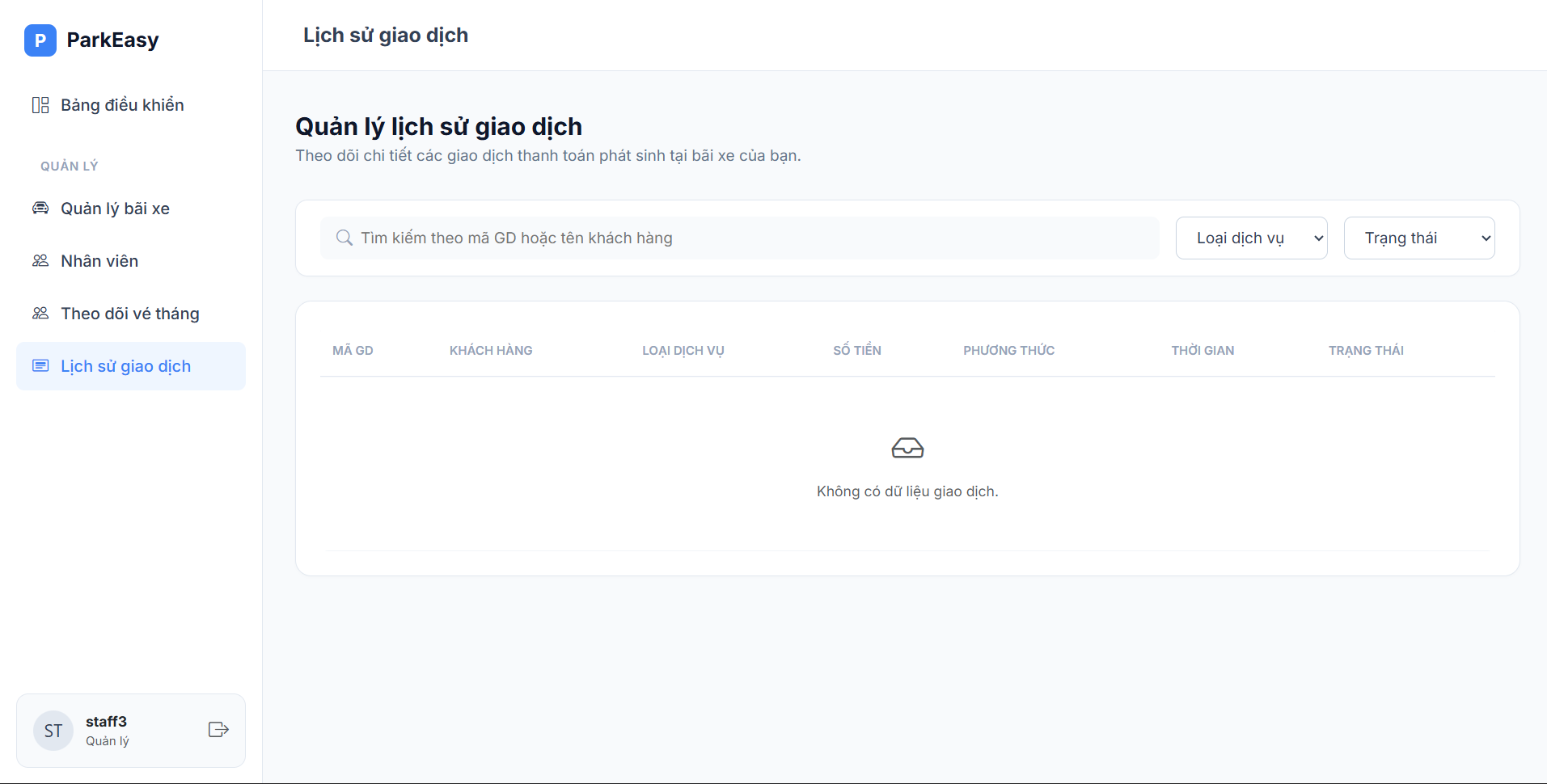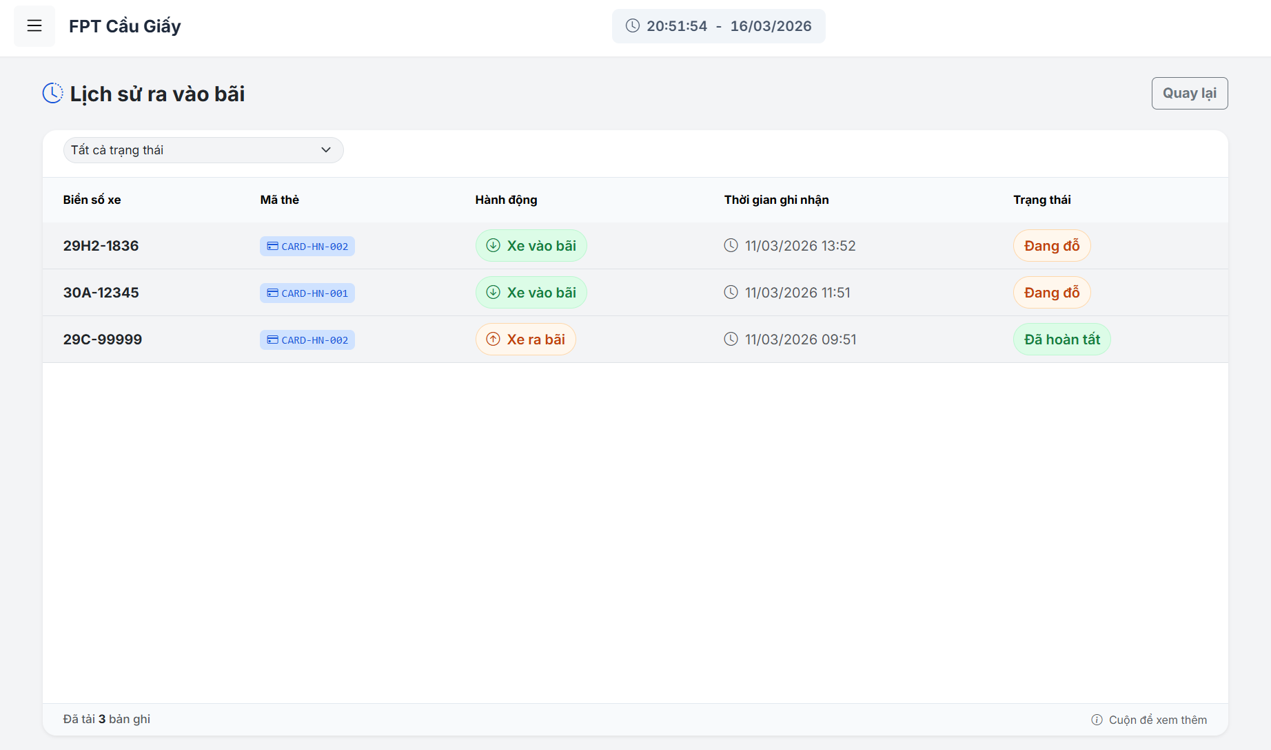 | 14 | Parking History Management | Parking History Screen | Track daily transaction logs. Shows a detailed table of completed parking sessions, including check-in/out timestamps, calculated fees, and total parking duration handled during the staff's shift. |