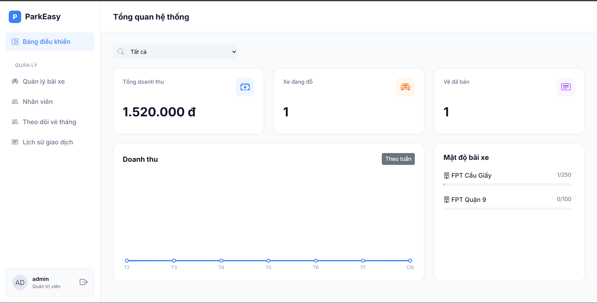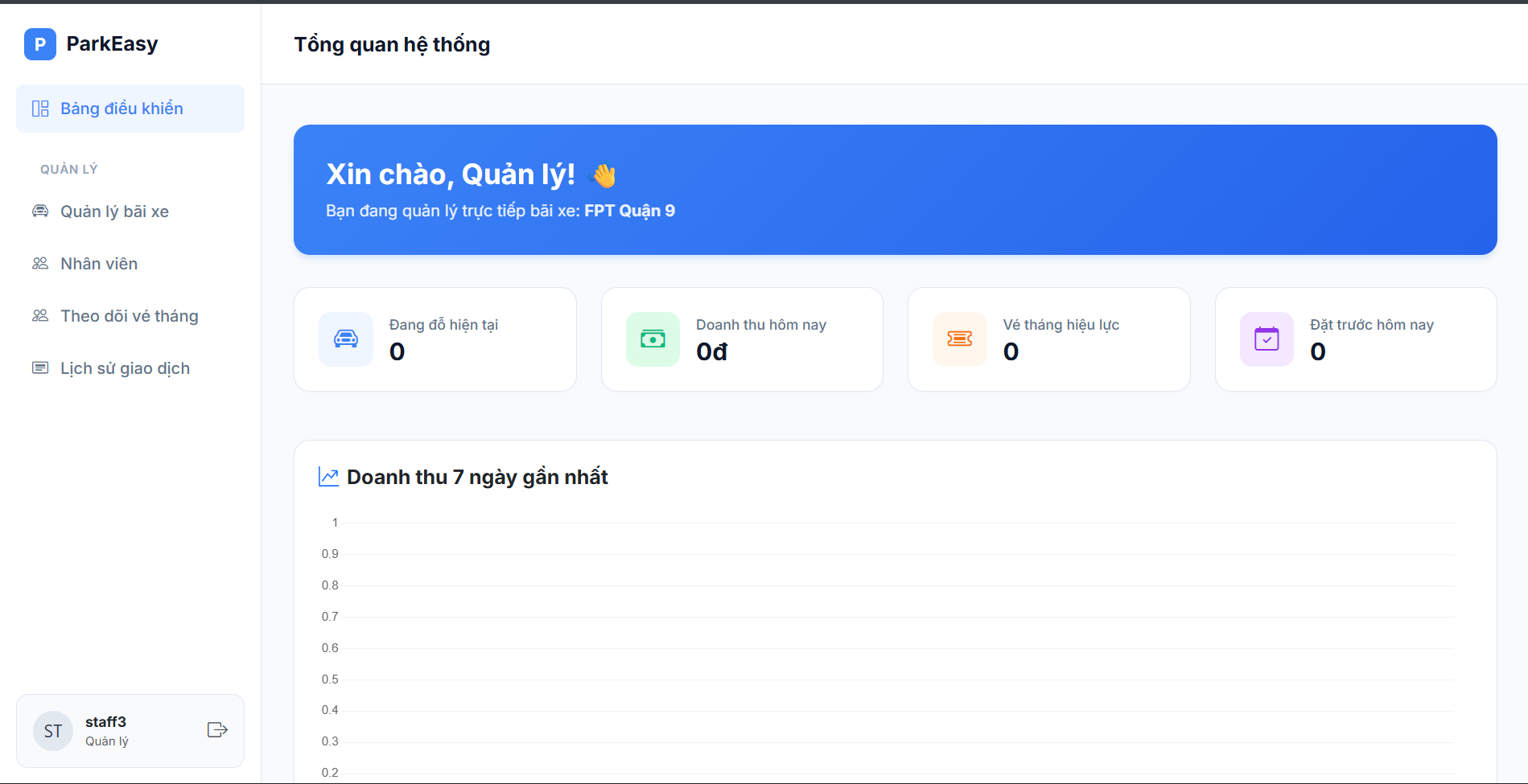 | 16 | Manager Dashboard | Manager Dashboard | Main interface for managers to view revenue, transactions, and statistics strictly for their assigned parking site. |