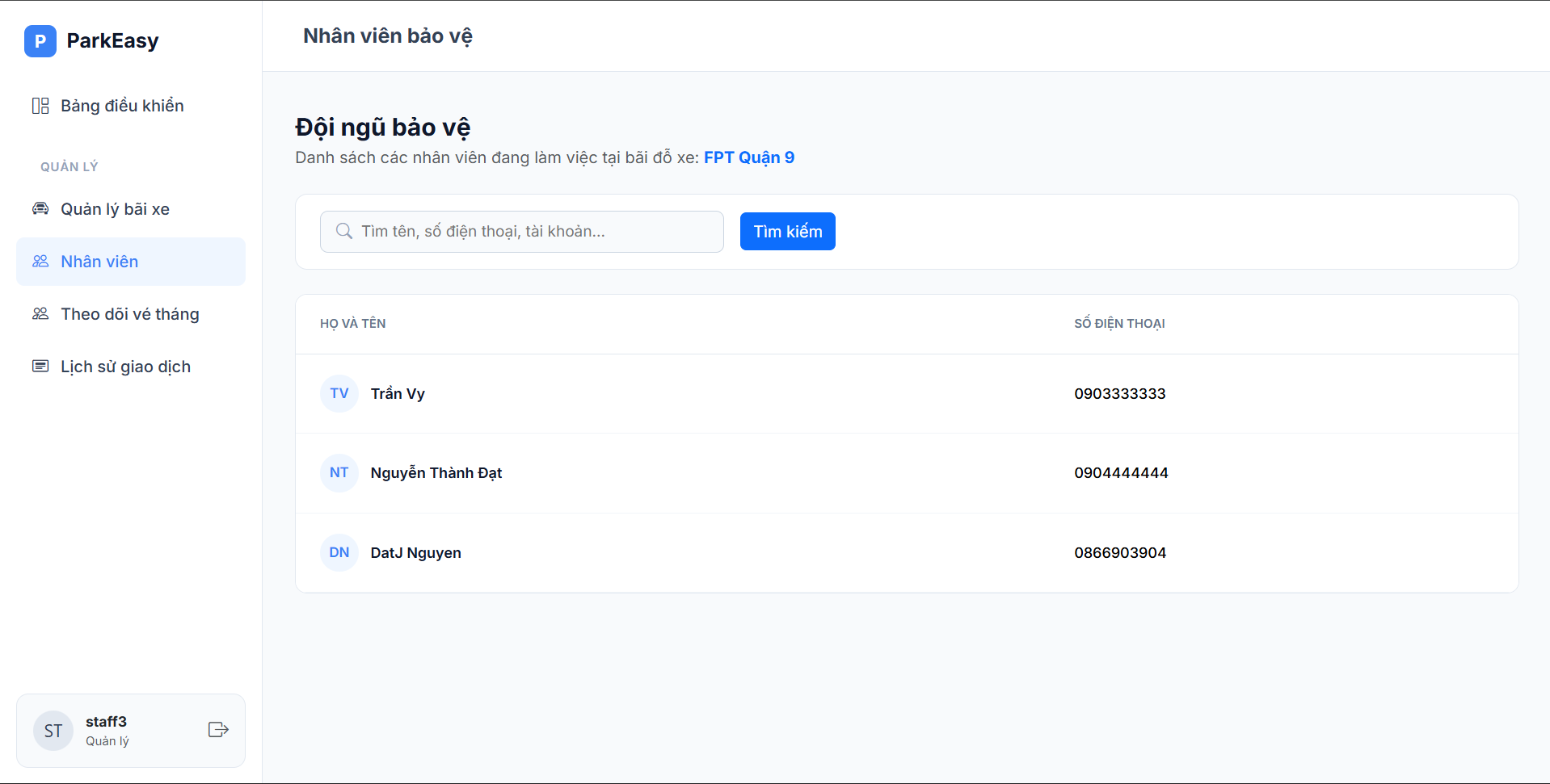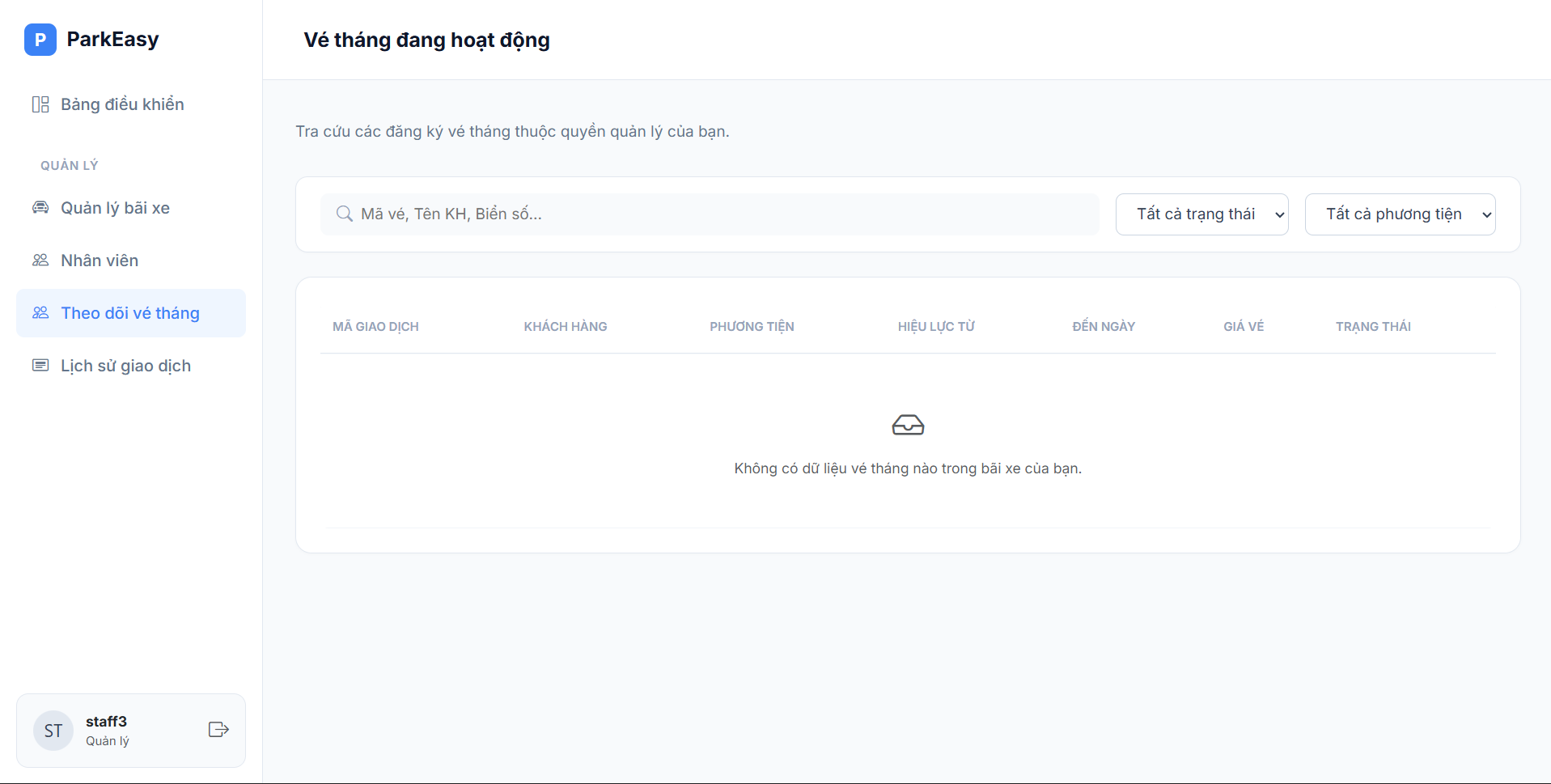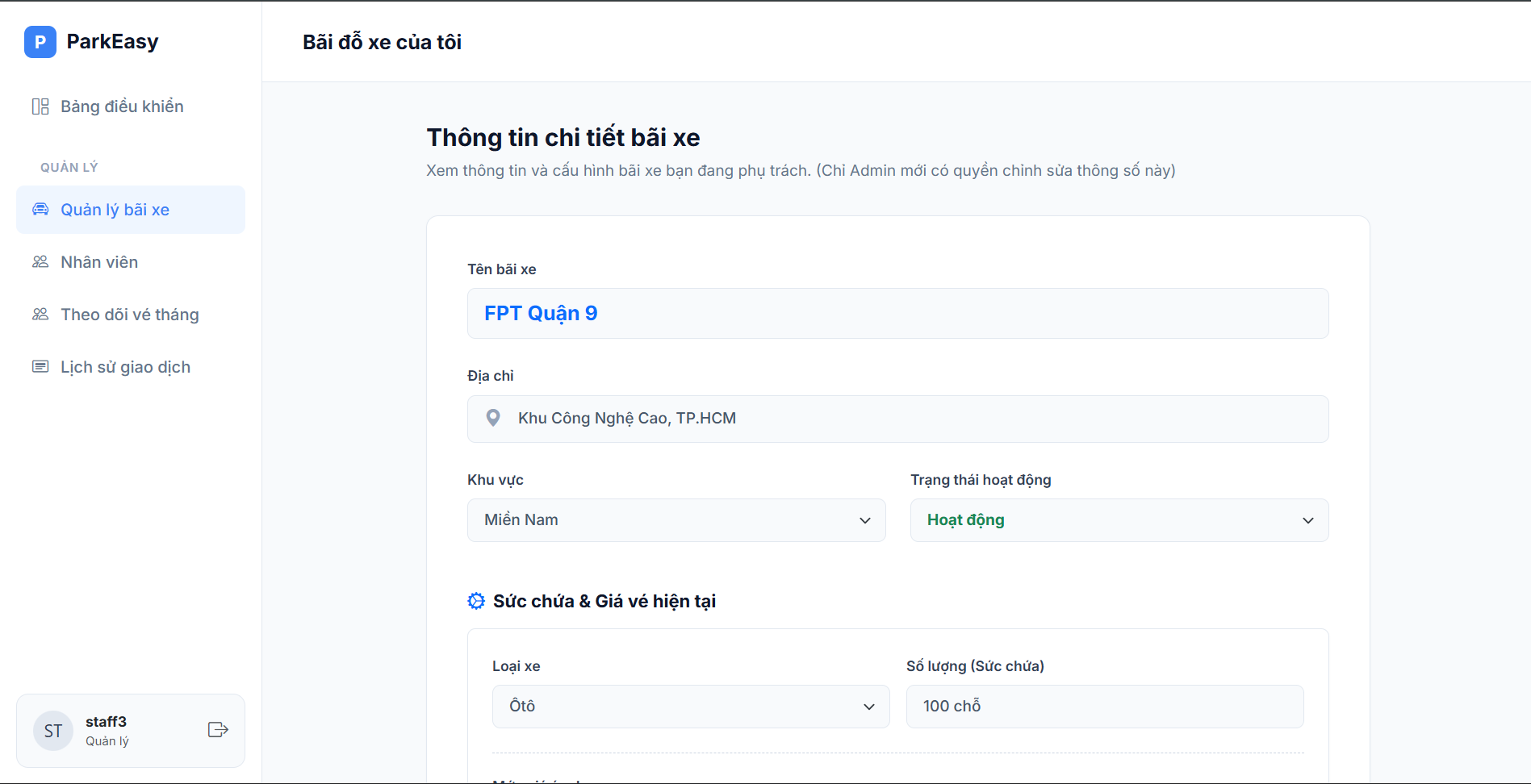 | 2 | Staff | Employees working directly at the parking facilities; responsible for managing parking cards, processing vehicle entries and exits (Check-in/Check-out), and monitoring current capacity. |