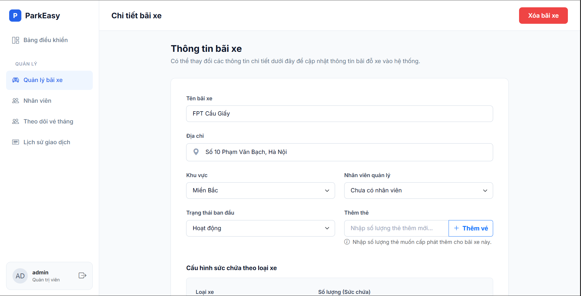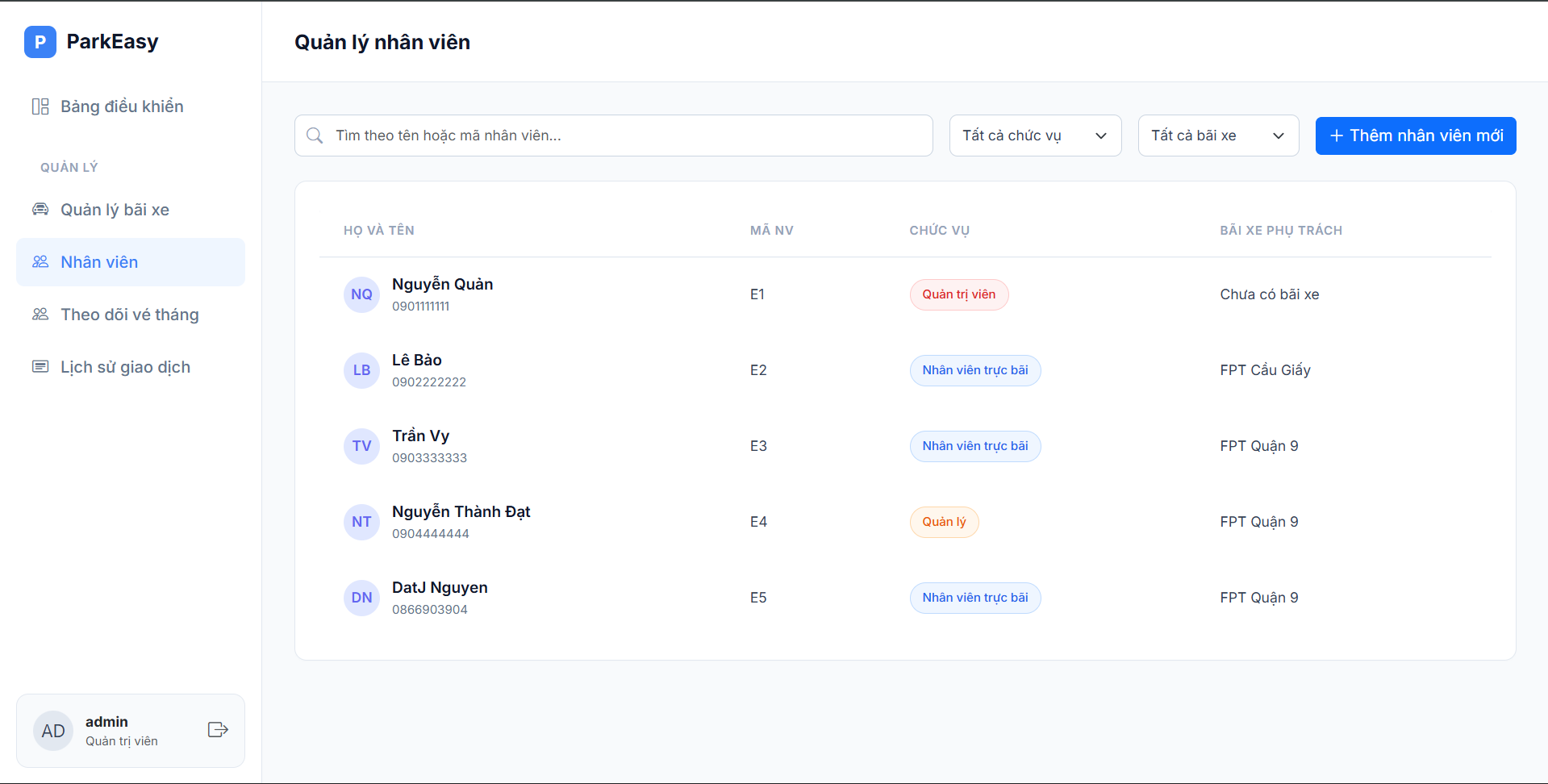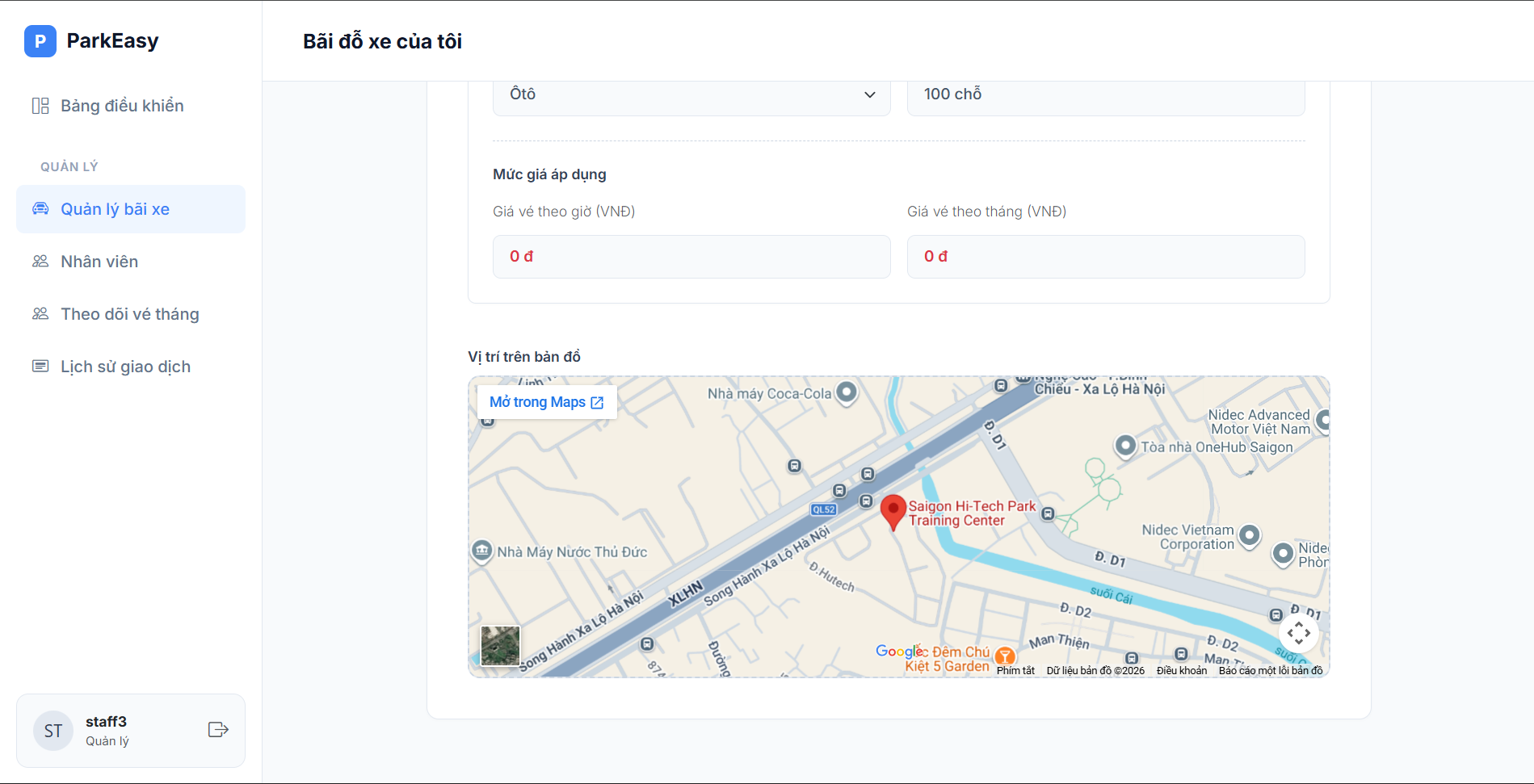 | 2 | Staff | Employees working directly at the parking facilities; responsible for managing parking cards, processing vehicle entries and exits (Check-in/Check-out), and monitoring current capacity. |