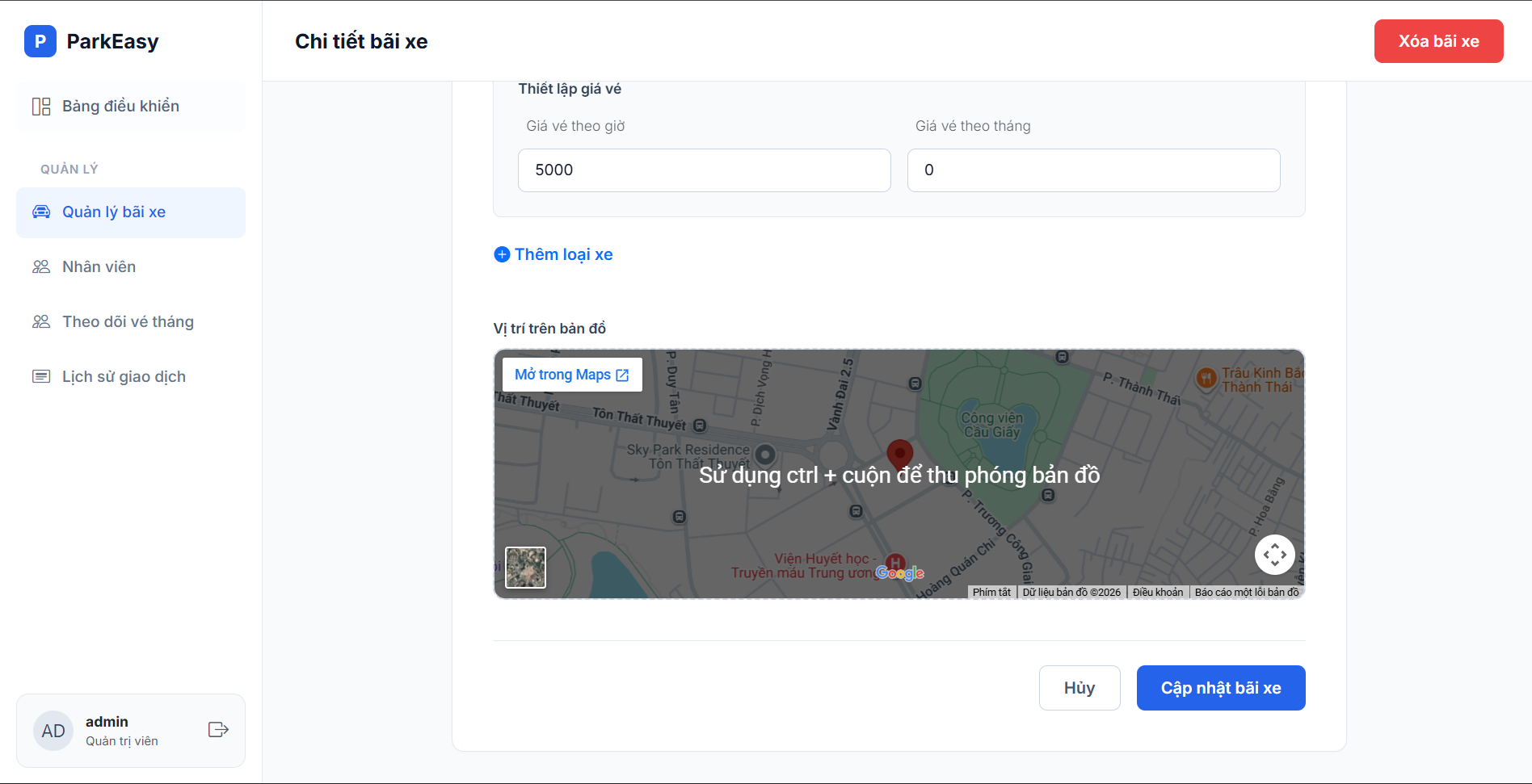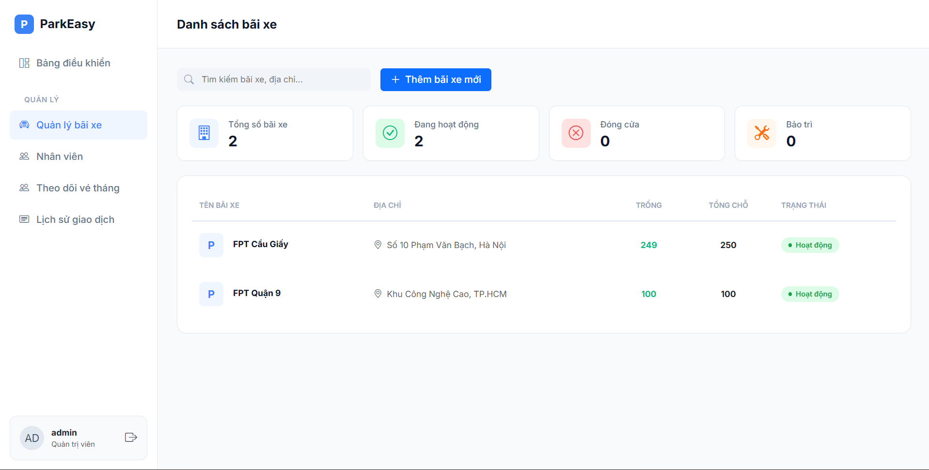 The project is developed using Java Servlet, JSP, and JDBC technologies, with data managed by the Microsoft SQL Server database system. This system was created to comprehensively digitize the parking operations process, enhance the accuracy of fee calculations, and optimize the overall experience for both drivers and facility operators.