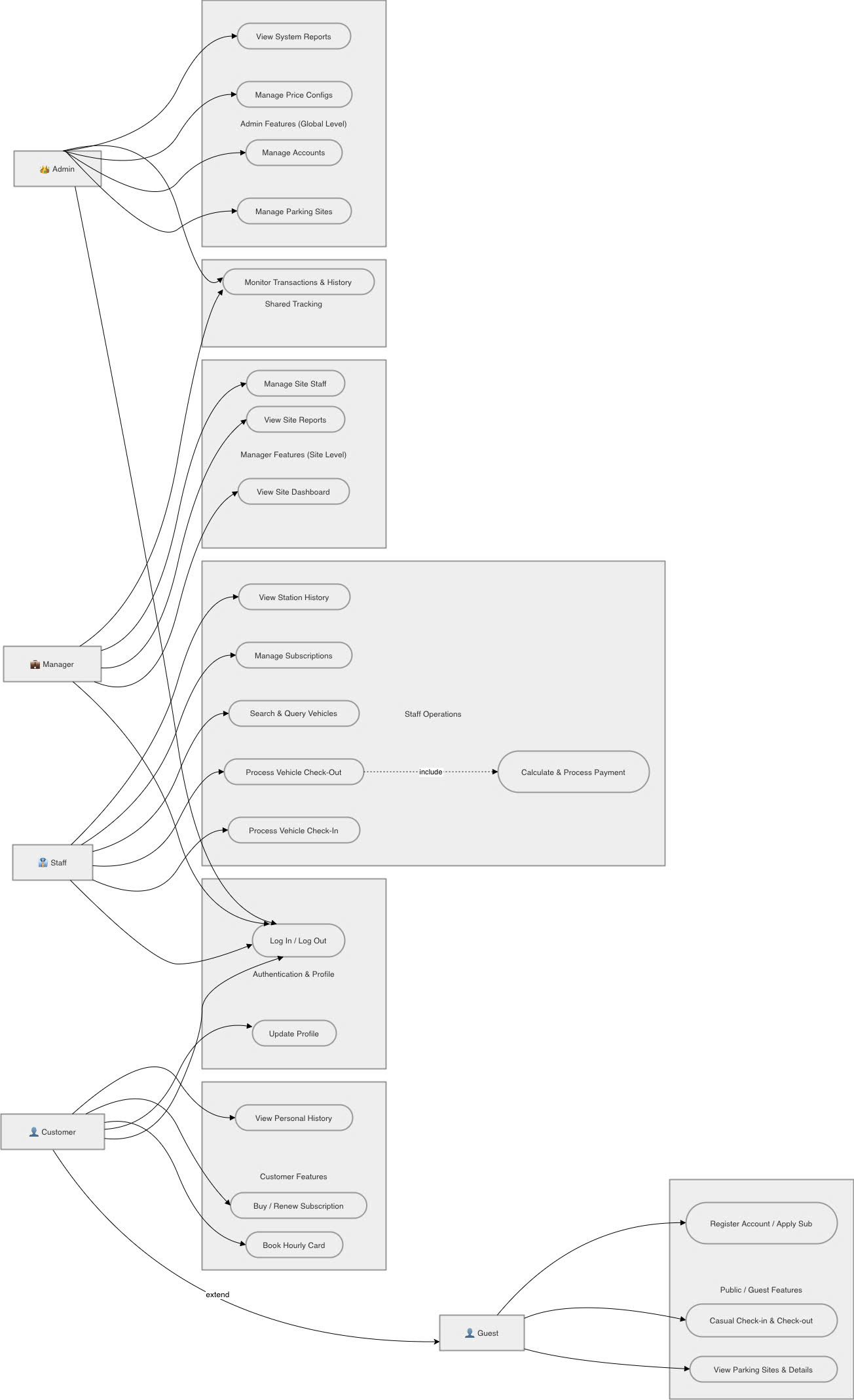 | 20 | Manage Pricing | Update ParkingSites | Admins can set up and dynamically update base prices (hourly, monthly) for different vehicle types. |