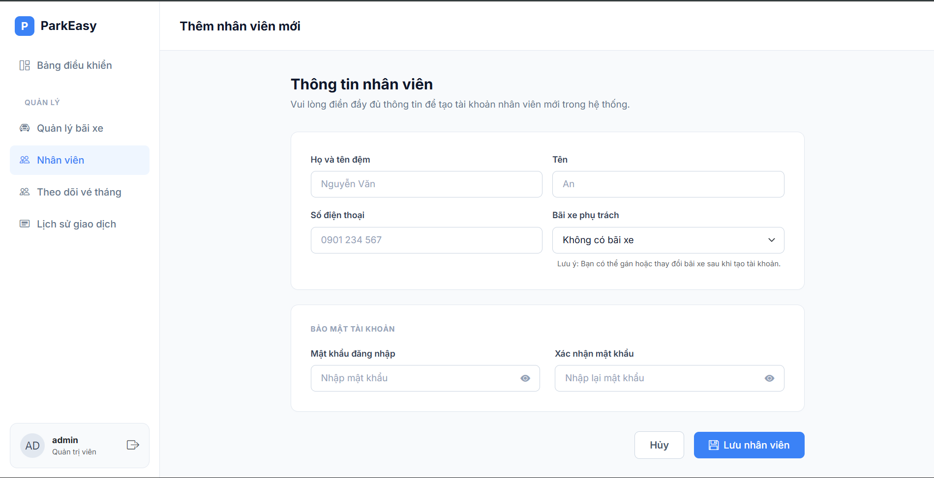| siteId | Dropdown (Select) | Selects the specific parking site the employee is assigned to work at (or "No site"). |