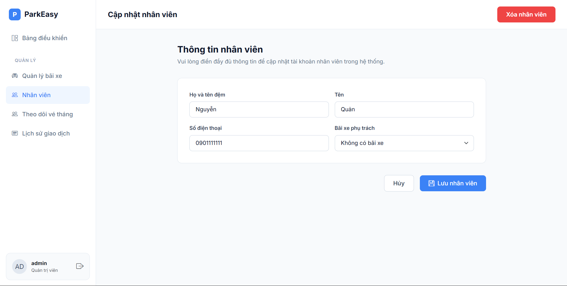 | siteId | Dropdown (Select) | Transfers this employee to manage or work at another parking site. |