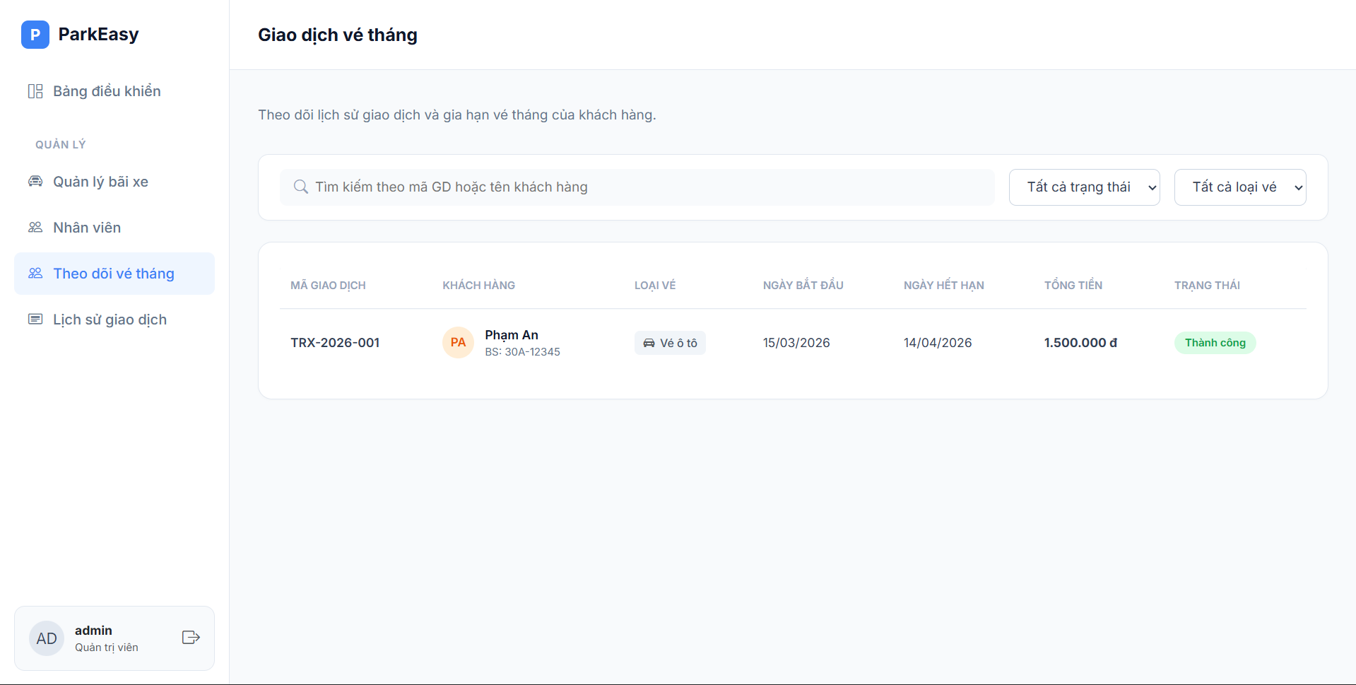 | 13 | Staff Subscription Management | Subscription Management Screen | Monitor and renew monthly parking passes. Displays a paginated list of registered subscribers, pass validity state (Active/Expired), vehicle details, and action buttons for pass renewal or registering new monthly tickets. |