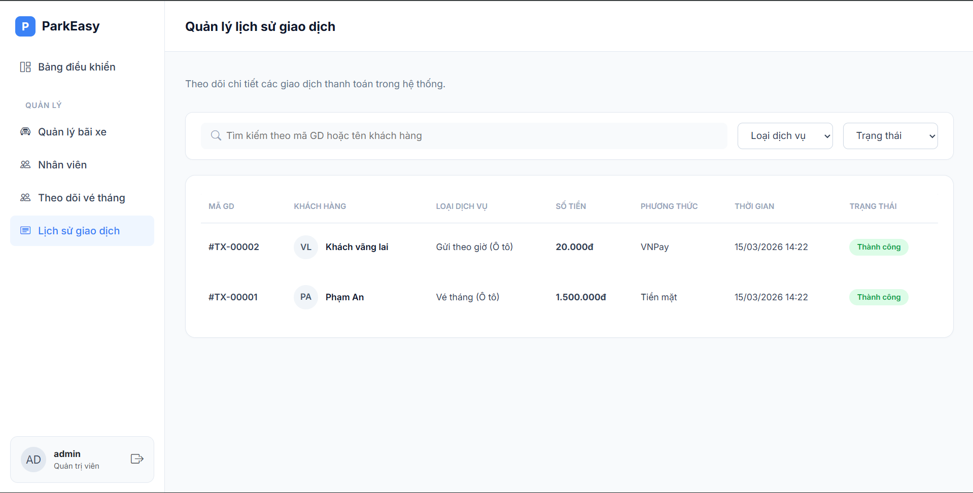 | transactionType | Dropdown (Select) | Filters records by payment type (Wallet Top-up, Subscription Purchase, Booking Deposit, Casual Parking Fee). |