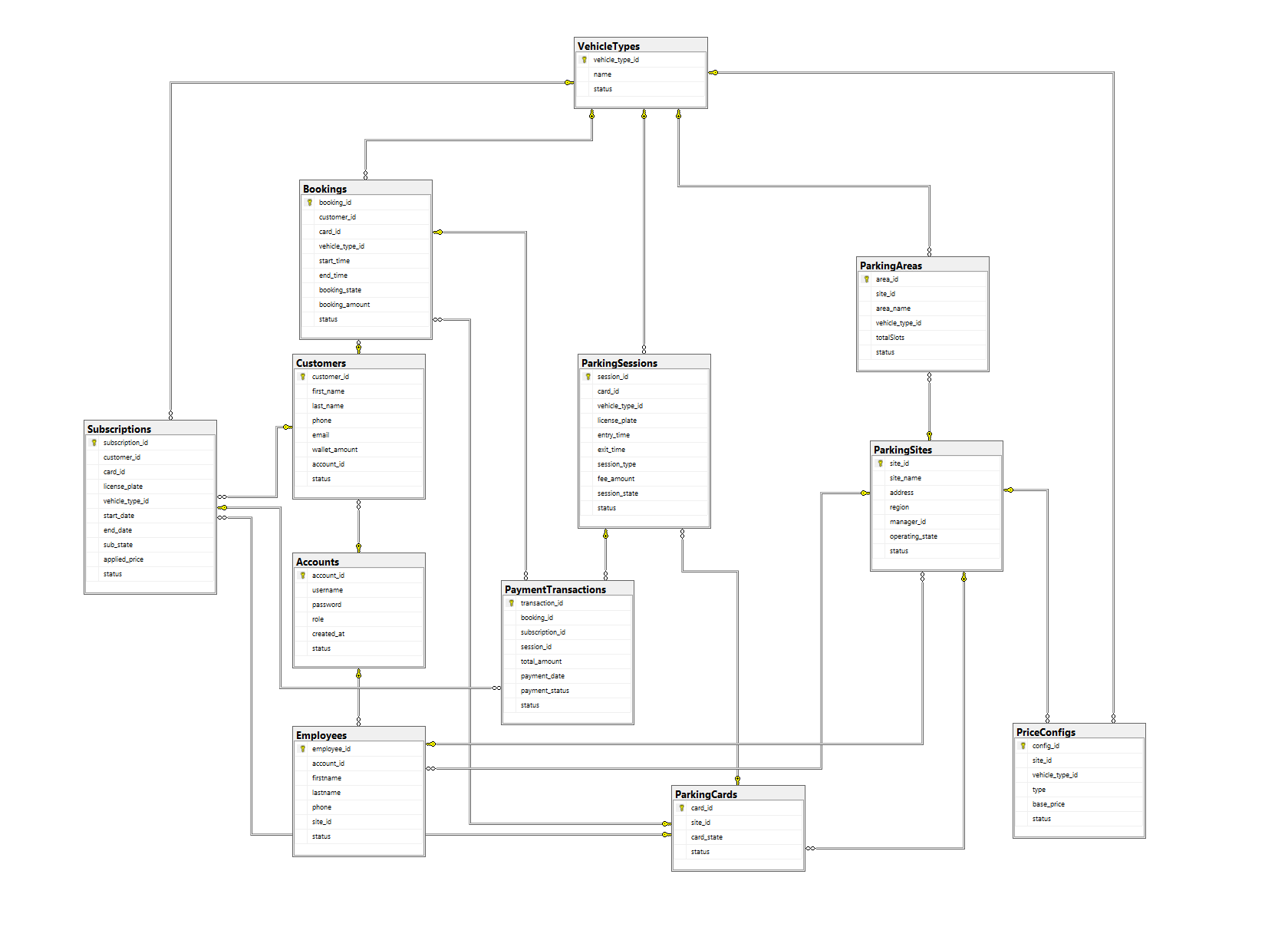 | 4 | Employees | Stores personal and contact information of staff and managers assigned to specific parking sites. |