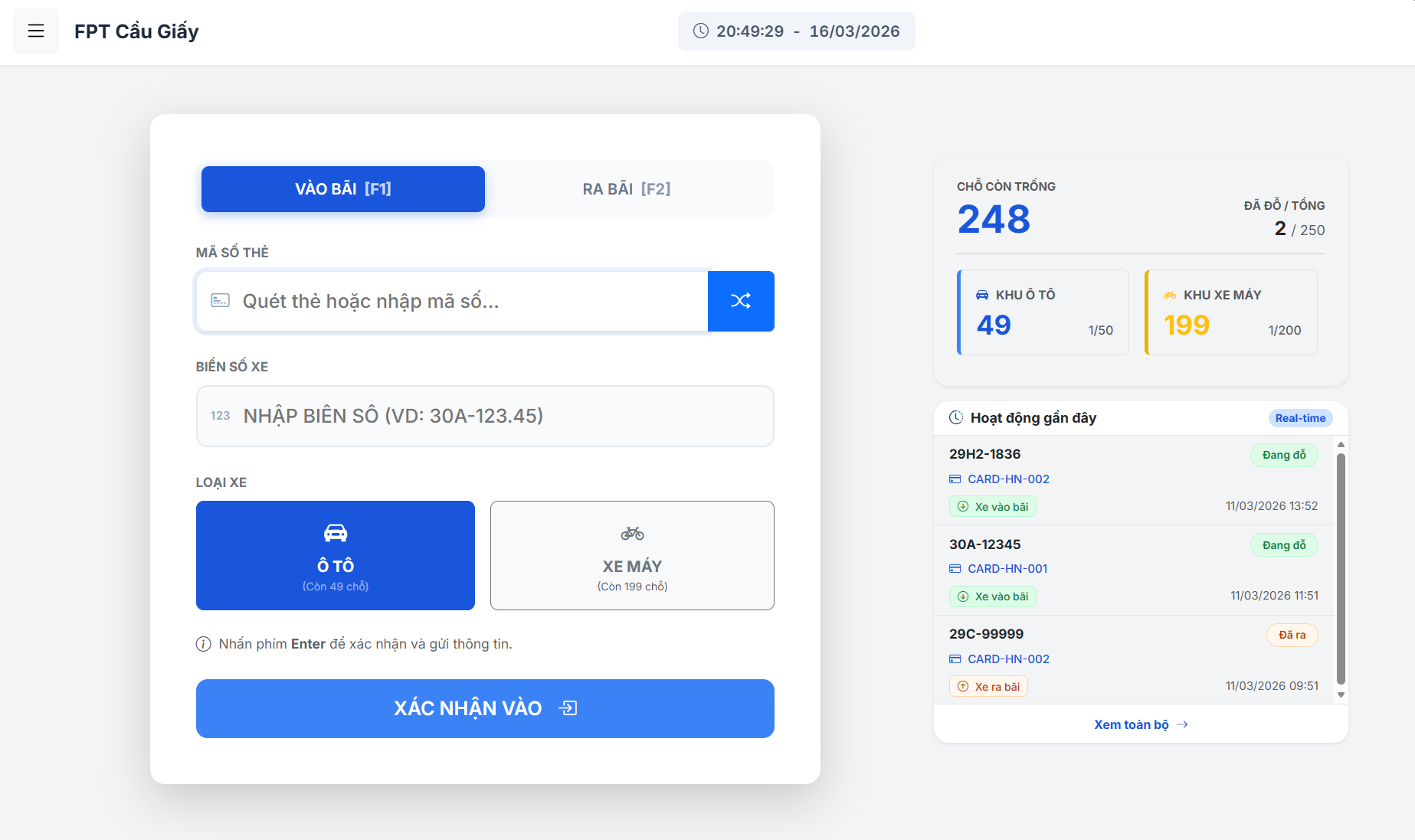 | 5 | Process Vehicle Check-In | Scan parking card, input/capture license plate, identify vehicle type (car/motorbike), and create an active parking session. | |