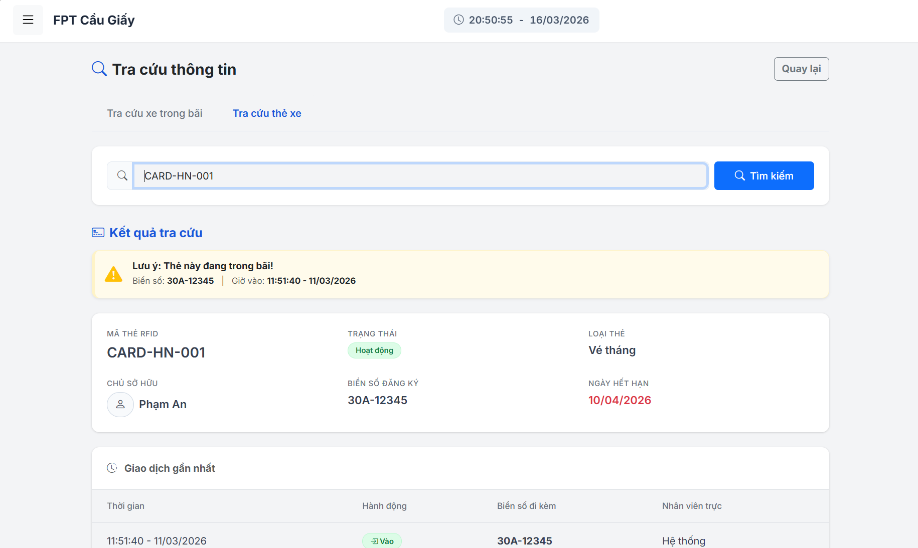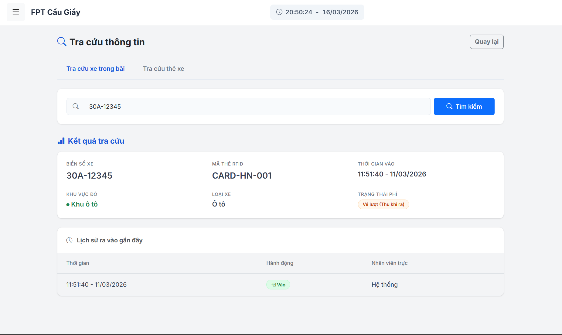 | 12 | Vehicle Searching | Vehicle Searching Page | Query real-time and historical vehicle data. Contains search inputs (by License Plate or Card ID), status filters, and a data table displaying current parking sessions, entry times, and vehicle types. |